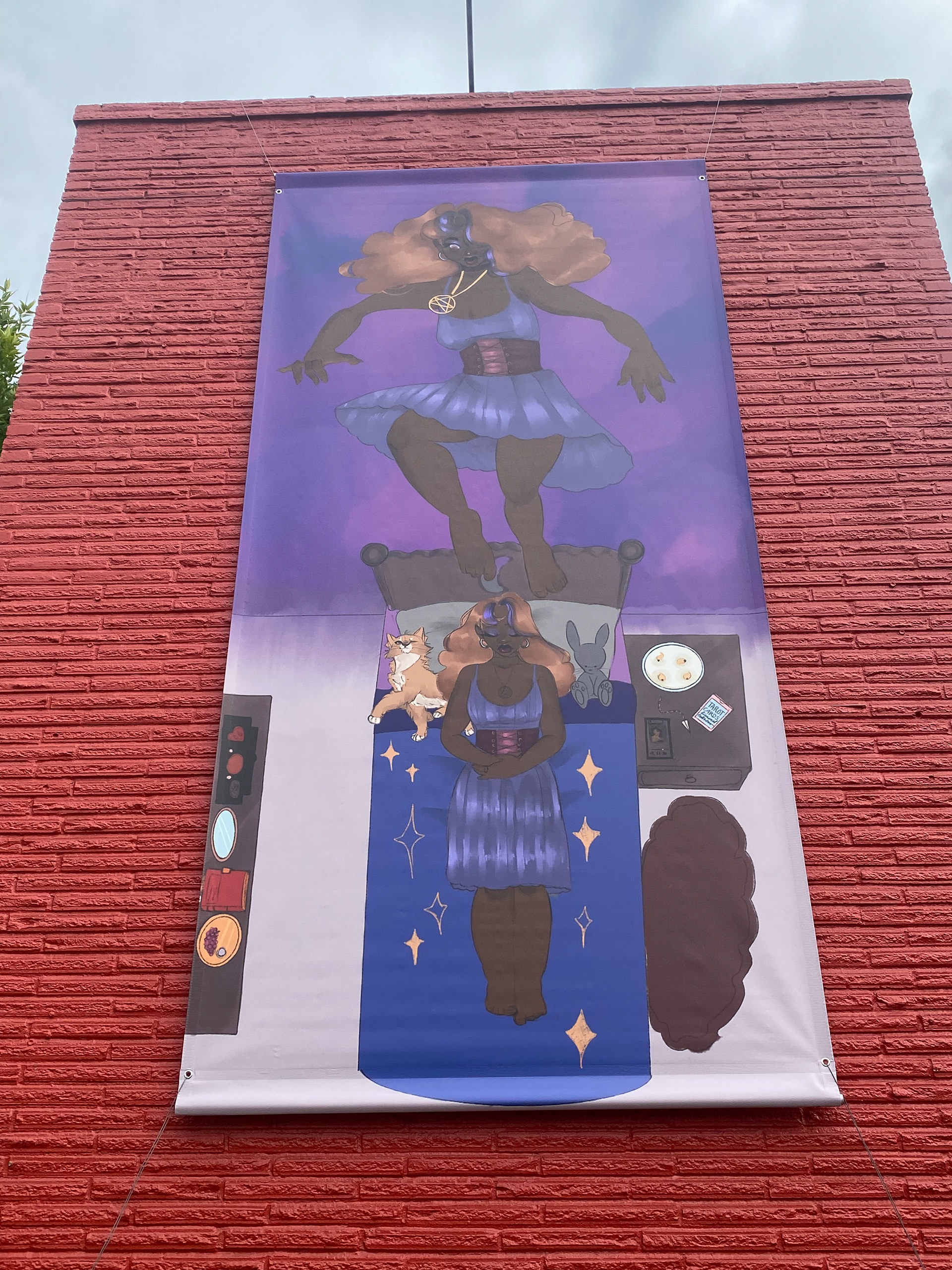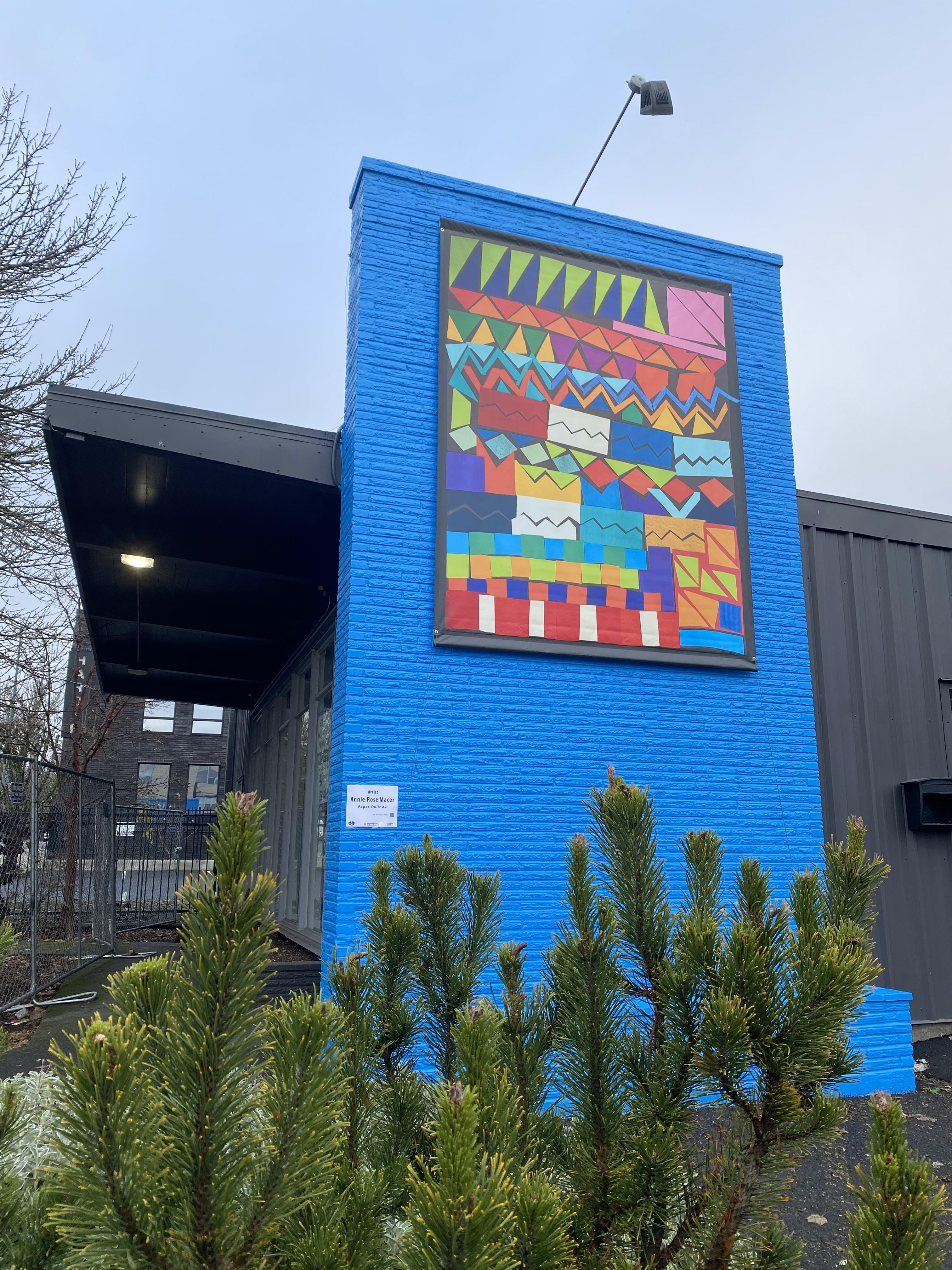 The Wall is a 10’ x 16’ dark brown brick wall, a gateway to NE Portland.  Artists are invited to submit proposals for banners with themes of equity, community, and diversity.